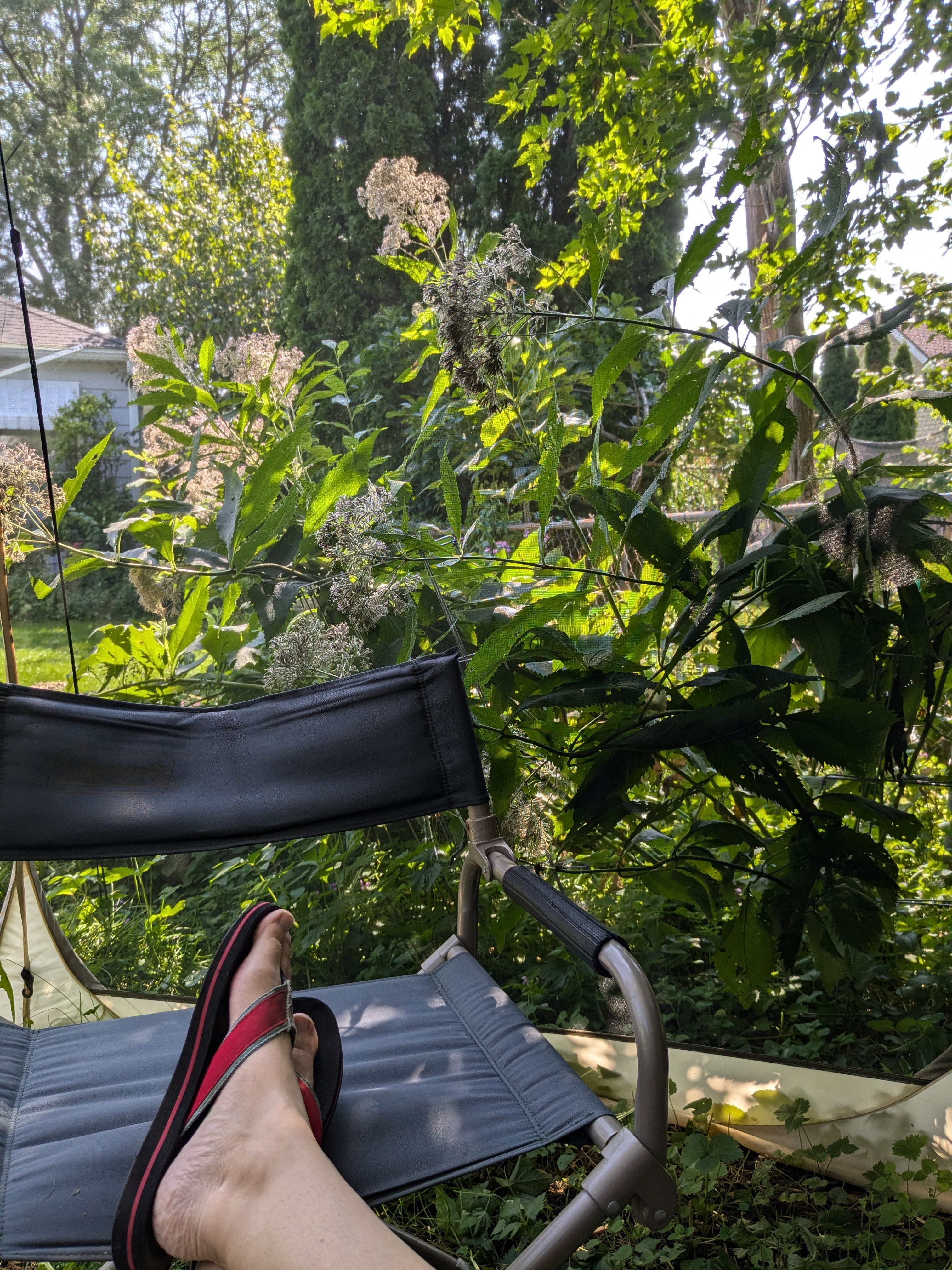 I am sitting in a lawn chair in our screen tent, which we so far have left up all summer so that I do not end up a dessicated husk from all the mosquitoes.