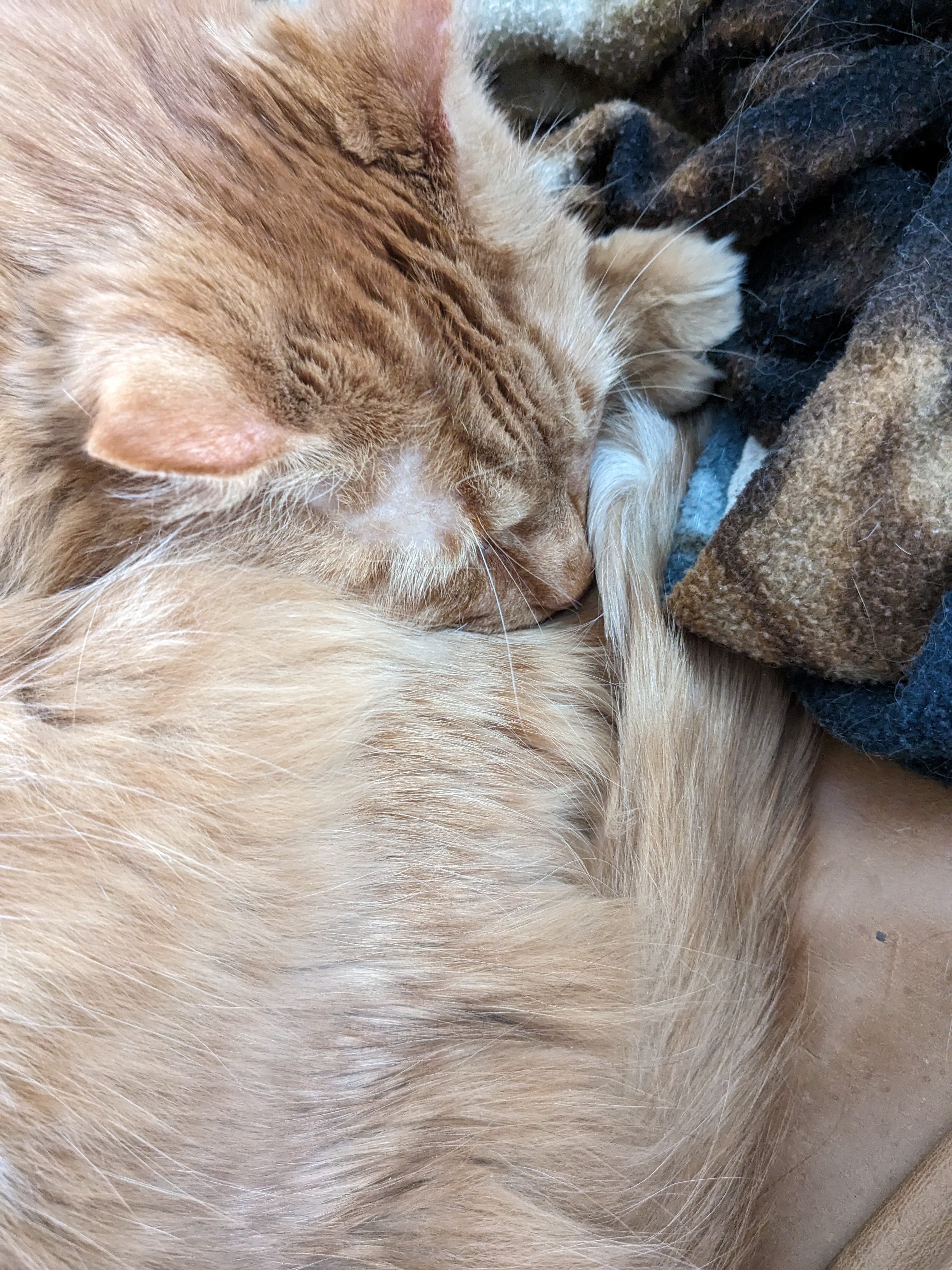 The other night I had to poke three different mammals of two different species to find out which one was snoring. It was my large orange cat, long haired and in his teens, like an aging hippy.